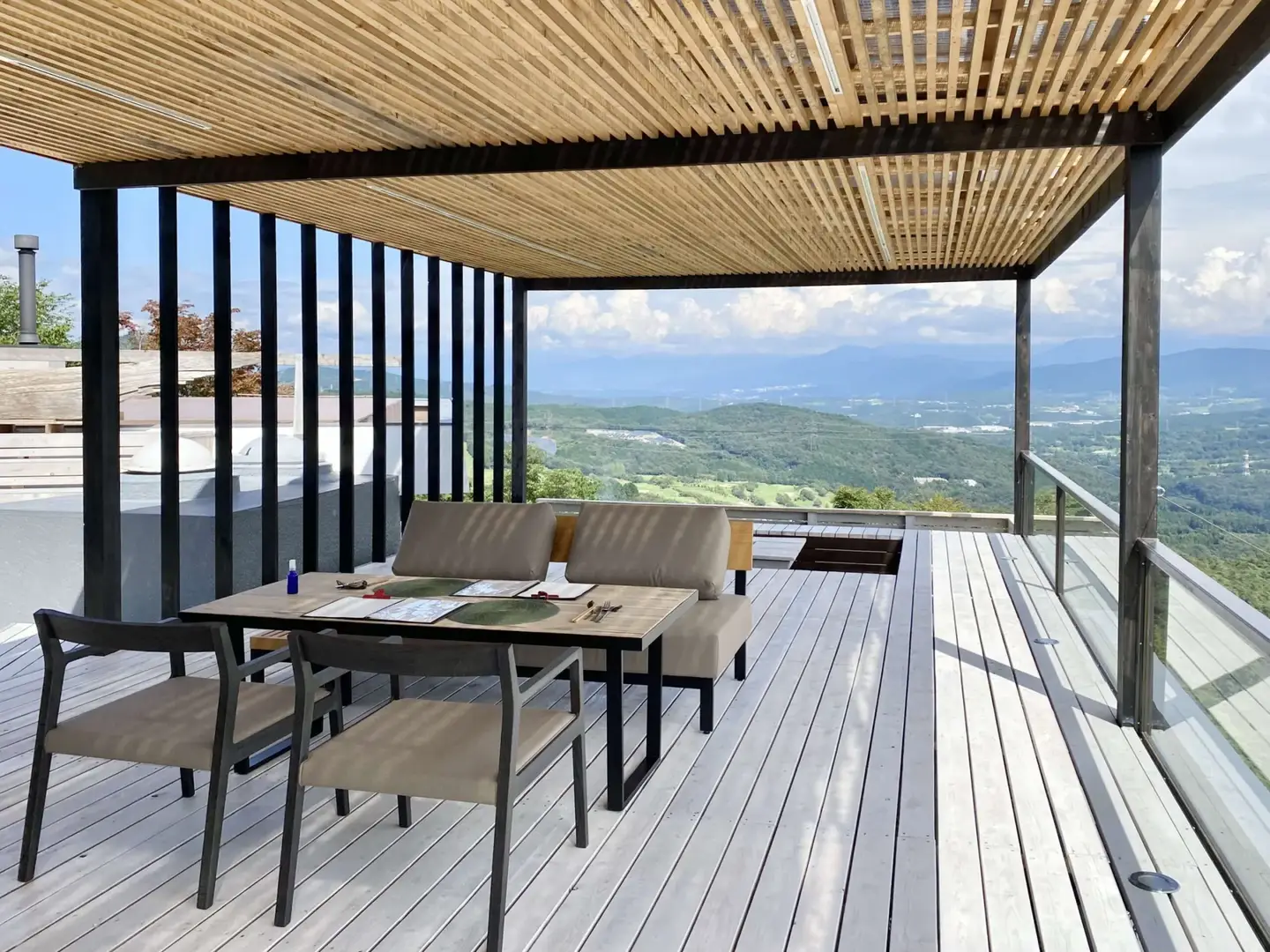 2022年7月よりオープンした「TEN KUH Lounge」は、建物の屋上を利用し廃材を再利用して1年かけて作られたサスティナブルなスペース。ここでは270度の絶景の大パノラマを見ながら「ネオ精進料理」と称したヴィーガンアフタヌーンティーなど、他にはない独自の料理が楽しめ、120㎡に4卓のみの贅沢なスペースは会員専用の完全予約制です。(クラウドファンディングで集まった会員は現在300名ほど)